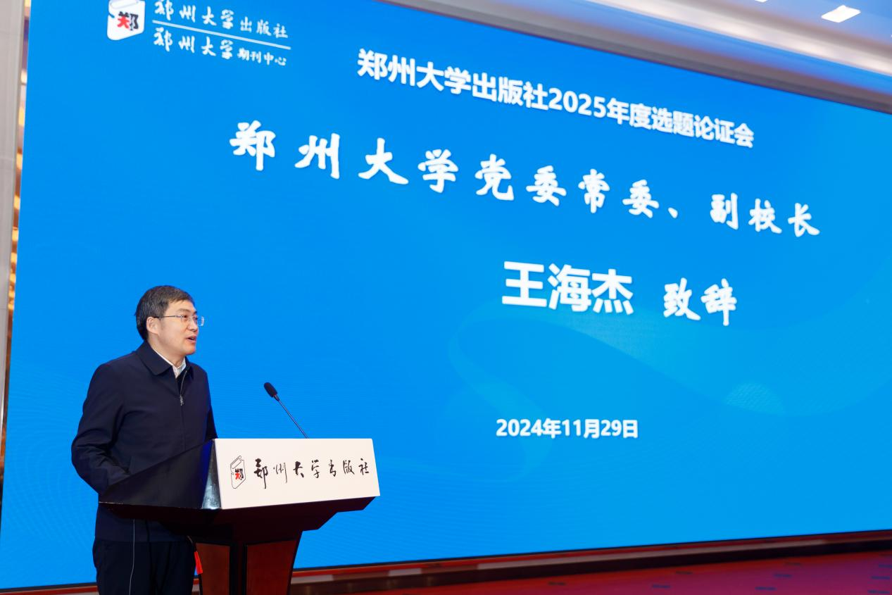 为深入贯彻习近平文化思想,严格落实选题论证制度,高质量做好2025年度选题工作,11月29日, 召开2025年度选题论证会。河南省委宣传部出版处处长张万勇,河南省教育厅二级巡视员、社语处处长韩冰,河南省文联党组成员、副主席李明;郑州大学党委常委、副校长王海杰,党委宣传部部长、 主任孙保营,图书馆党委书记崔青峰; 党委副书记、纪委书记李果,副社长吴昕以及特邀点评专家河南大学张云鹏教授、郑州大学宋建学教授等出席会议。来自河南省文学院、河南省小说研究会以及出版社全体干部职工等共计150余人参加会议。会议开幕式、选题汇报环节与闭幕式分别由 党委书记杨雪冰,社长、总编辑、期刊中心主任卢纪富,副总编辑、期刊中心副主任赵秋民主持。王海杰致辞。他首先感谢省委宣传部、省教育厅一直以来对我校及出版社的关心和支持,充分肯定了过去一年出版社在党的建设、出版主业、重点项目、人才队伍以及服务学科建设等方面取得的成绩。他表示,选题是出版的灵魂,要着重策划一批既能体现郑州大学的学科优势和学术特色,又能回应社会发展的重大关切,具有创新性、前瞻性和实用性的选题。他强调,一是要提高政治站位,明确一流定位;二是要擦亮特色品牌,强化选题集群;三是要牢记初心使命,服务母体大学,为推动河南文化事业的繁荣发展贡献郑大出版人的智慧与力量。