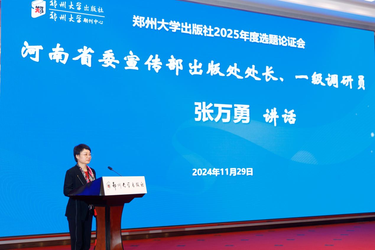 张万勇讲话。她指出, 不断强化党建引领、遵循出版规律、优化图书结构、提升出版质量,实现社会效益和经济效益双效提升,为推动河南省文化繁荣发挥了积极作用。她强调,出版工作是党的宣传思想文化工作的重要组成部分,在选题与出版方面必须要坚持深入学习贯彻习近平文化思想,自觉担当新的文化使命;要守好质量生命线,坚持立项要慎、把关要严、特色要亮、编校要细、推进要实、质量要高、营销要活;要强化队伍建设,持续打造出版人才“蓄水池”,为推动文化强国、文化强省做出应有贡献。